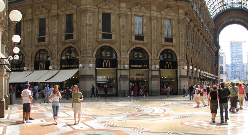 I den exklusiva gallerian bland alla lyxiga italienska klädmärken ligger denna McDonalds. Gallerian är det äldsta shoppinggalleriet i Italien och riktar sig till den rika publiken och turister som besöker Italien. Från torget kan du följa de många ljusstrålarna till modedistriktet, en riktig vacker och historisk plats.