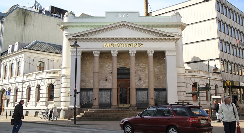 Norges femte största stad, Kristiansand, är en vacker stad och har en McDonalds i en gigantisk gammal bank. Med ståtliga kolumner och gjutning i marmor är byggnaden verkligen imponerande bara att titta på. Idag kan du inte längre öppna ett sparkonto, men du kan kanske kan beställa en klassisk McDonalds-meny