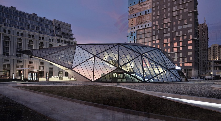 Utsidan av denna McDonalds liknar en snygg nyproducerad idrottsarena och ligger i Batumi, Georgien. Utsikten från insidan ger möjligheten för besökare att titta på den fantastiska fontänen. Byggnaden är täckt av 460 glaspaneler, medan hela byggnaden är omgiven av en reflekterande pool vars strömmande linjer efterliknar de jazziga formerna från 1950-talets tapeter. Interiören har matplatser som vetter mot den reflekterande poolen och en uteservering med en förvånansvärt stor växtlighet.